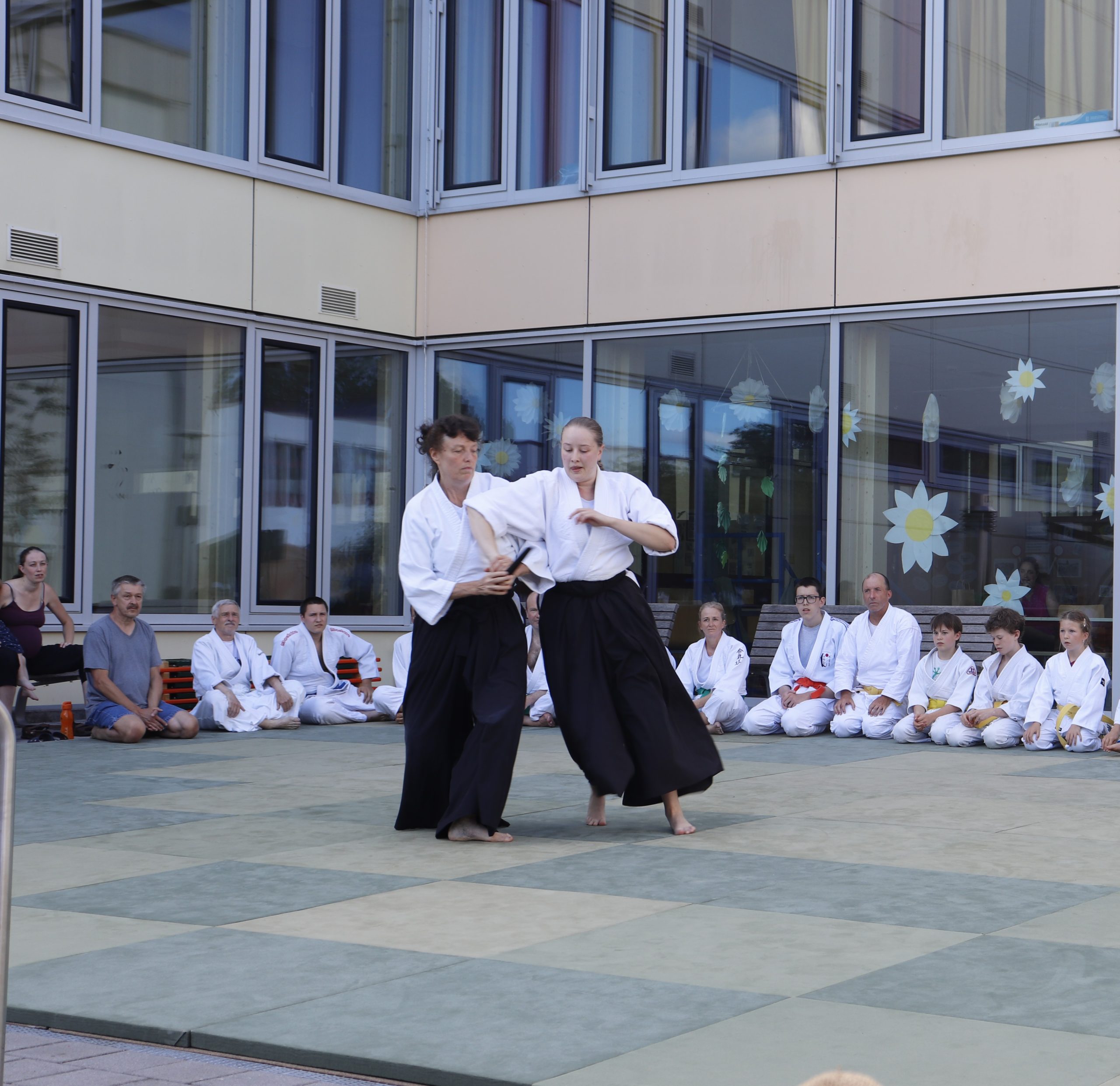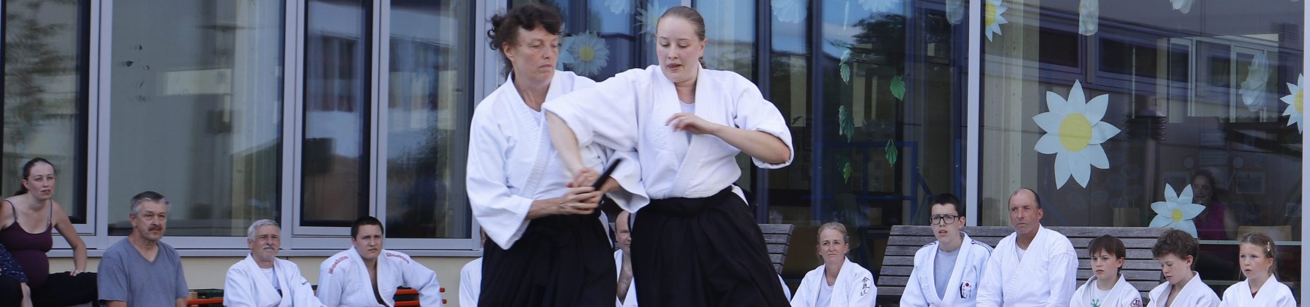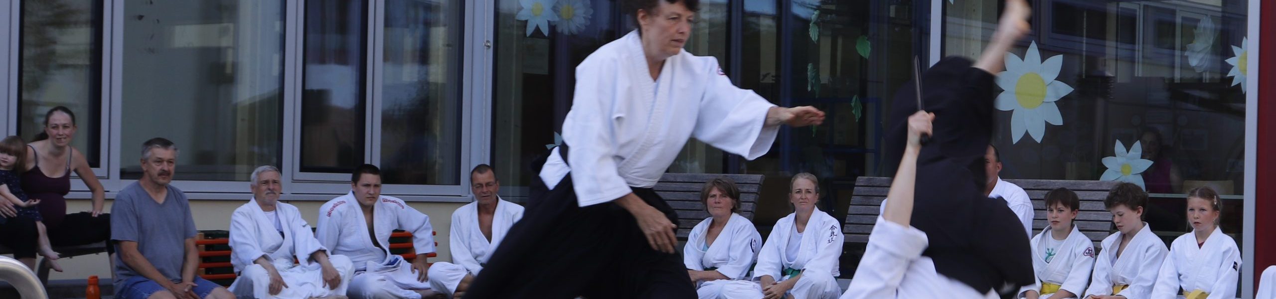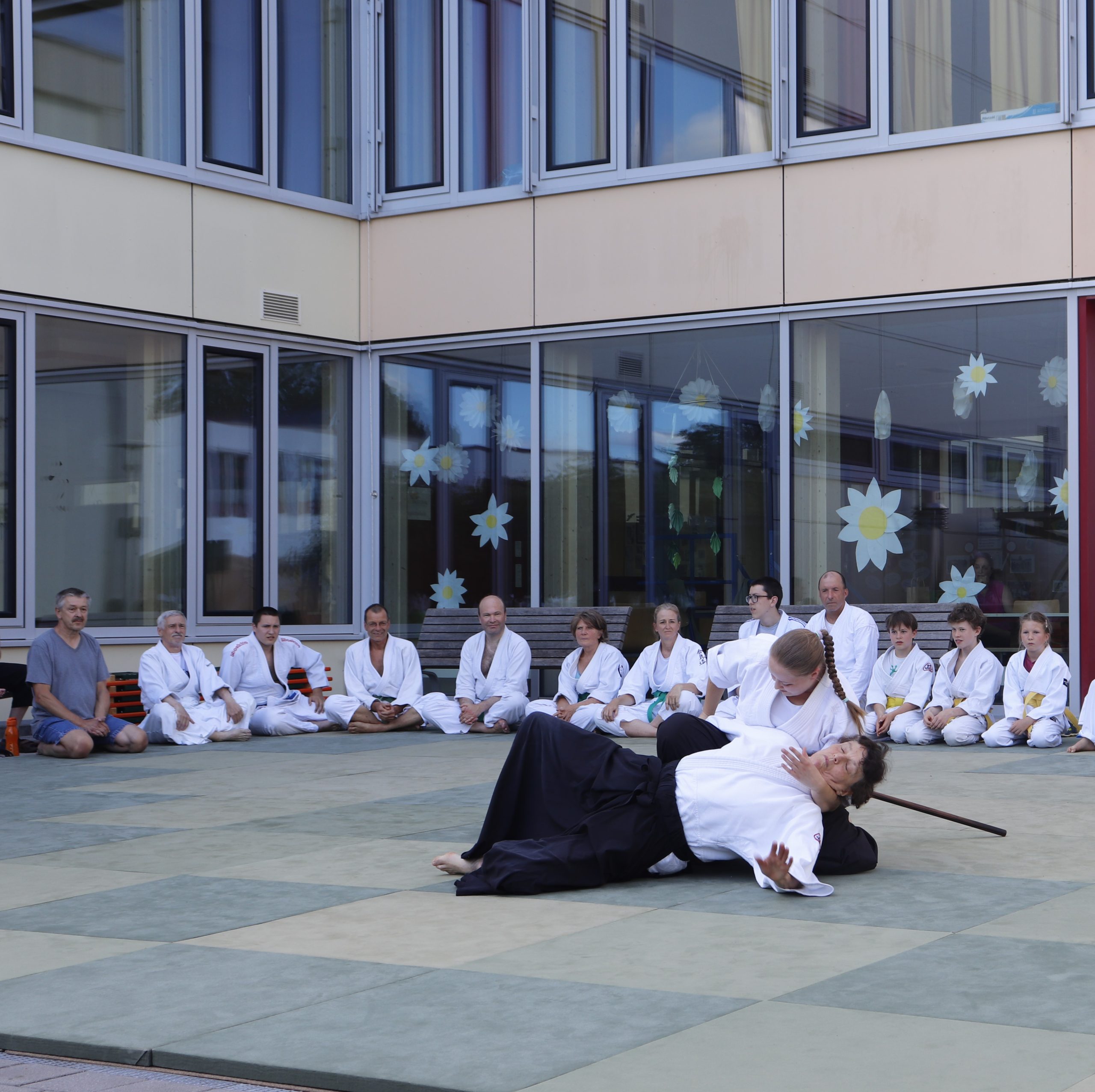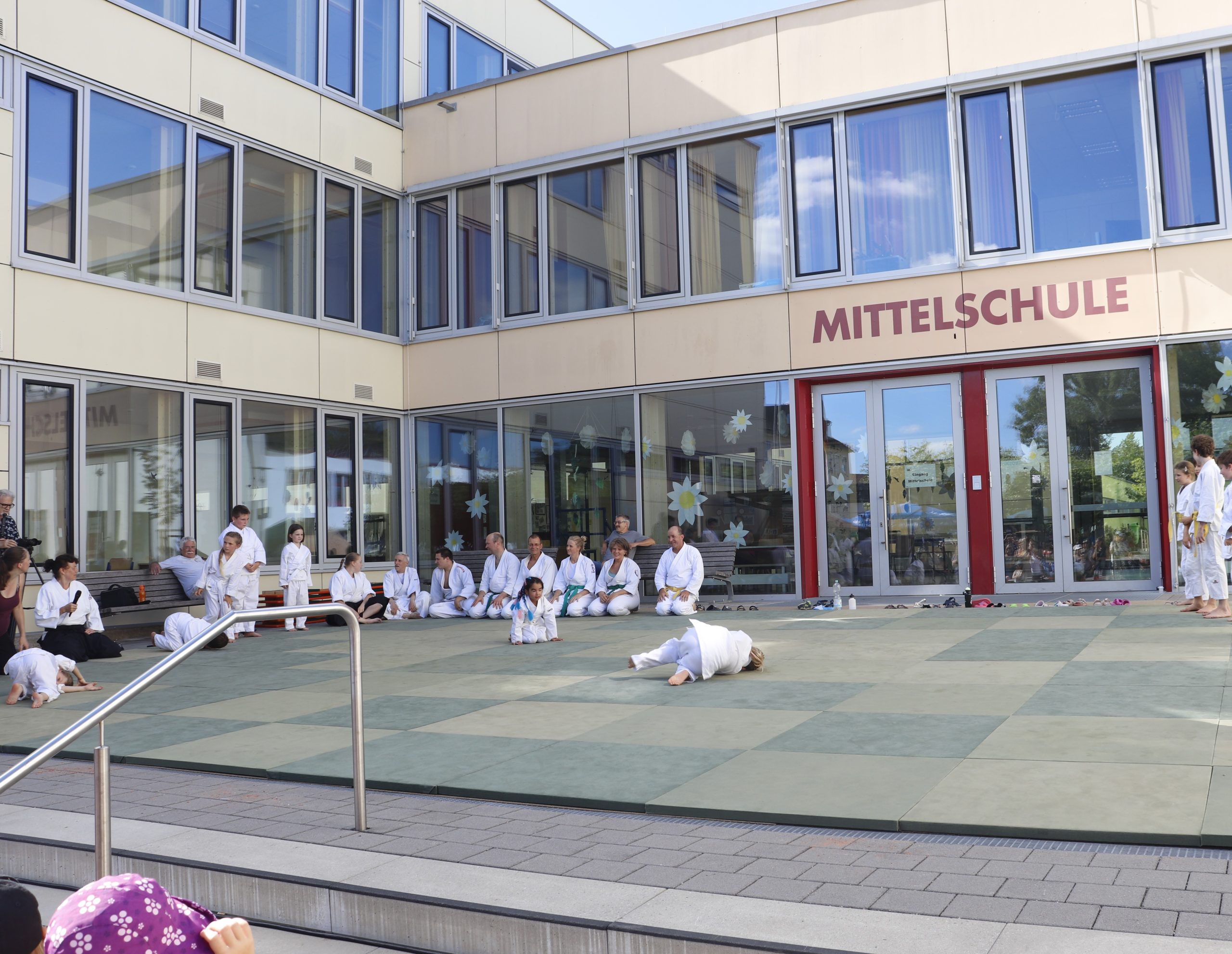 Nach wochenlangem Training war es um ca. 17 Uhr dann endlich so weit: Am Haupteingang der Mittelschule wurden noch schnell unsere Matten ausgelegt und dann ging es endlich los. Unsere jungen Aikidoka begannen mit der Fallschule. Im Anschluss führten die Minis voller Eifer ihre ersten gelernten Techniken vor. Nun stieg die Konzentration der Kinder, Jugendlichen und der Erwachsenen. Es wurden die verschiedenen Fall- und Bodenhaltetechniken präsentiert, je nach Stand des Könnens. Zum Abschluss zeigten unsere Dan-Träger (Aikidoka mit schwarzem Gürtel), wie man Aikido im Alltag einsetzen kann und begeisterten die Zuschauer mit Techniken zur Abwehr von Angriffen mit Waffen. Alle Beteiligten freuten sich über die gelungene Aufführung und erhielten von den Zuschauern viel Beifall.