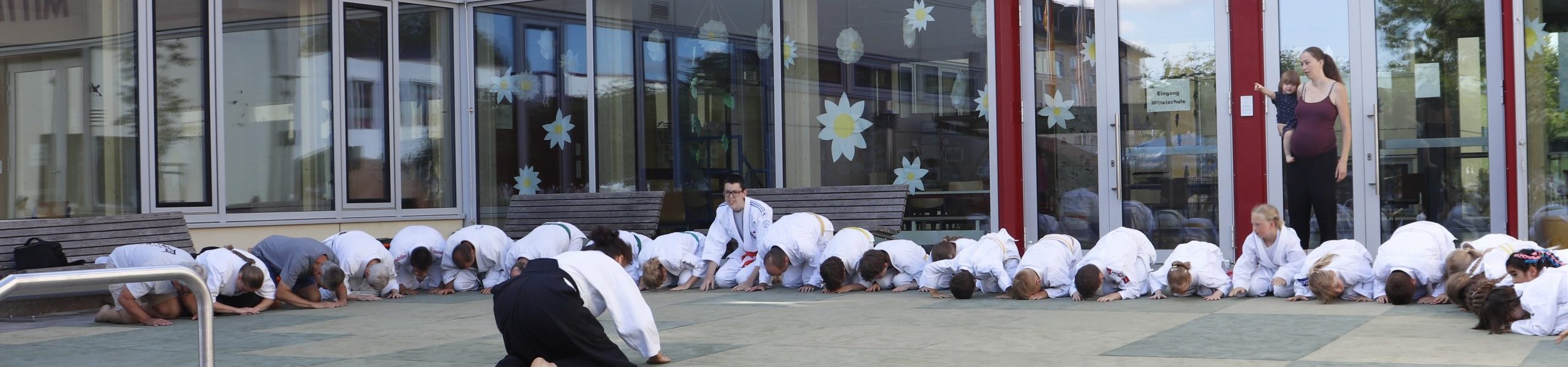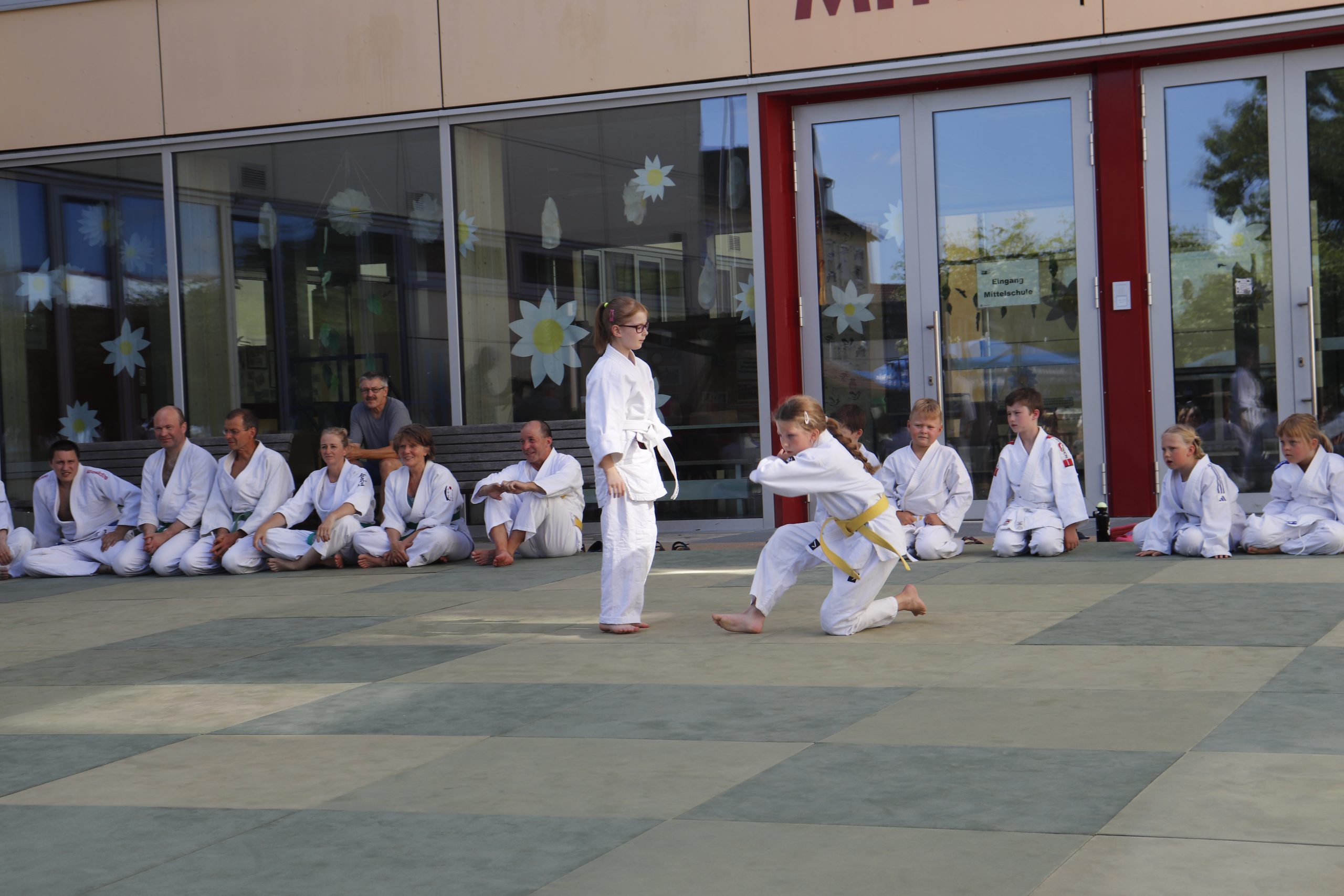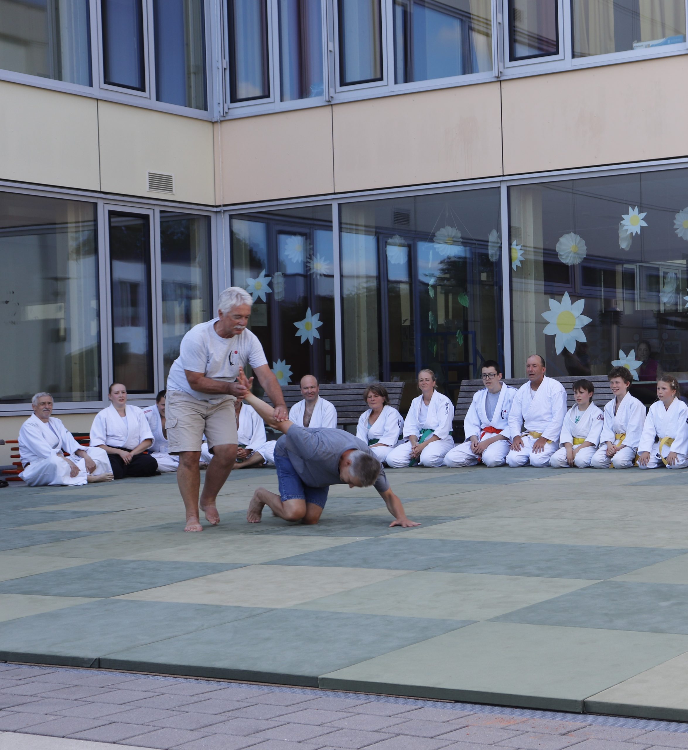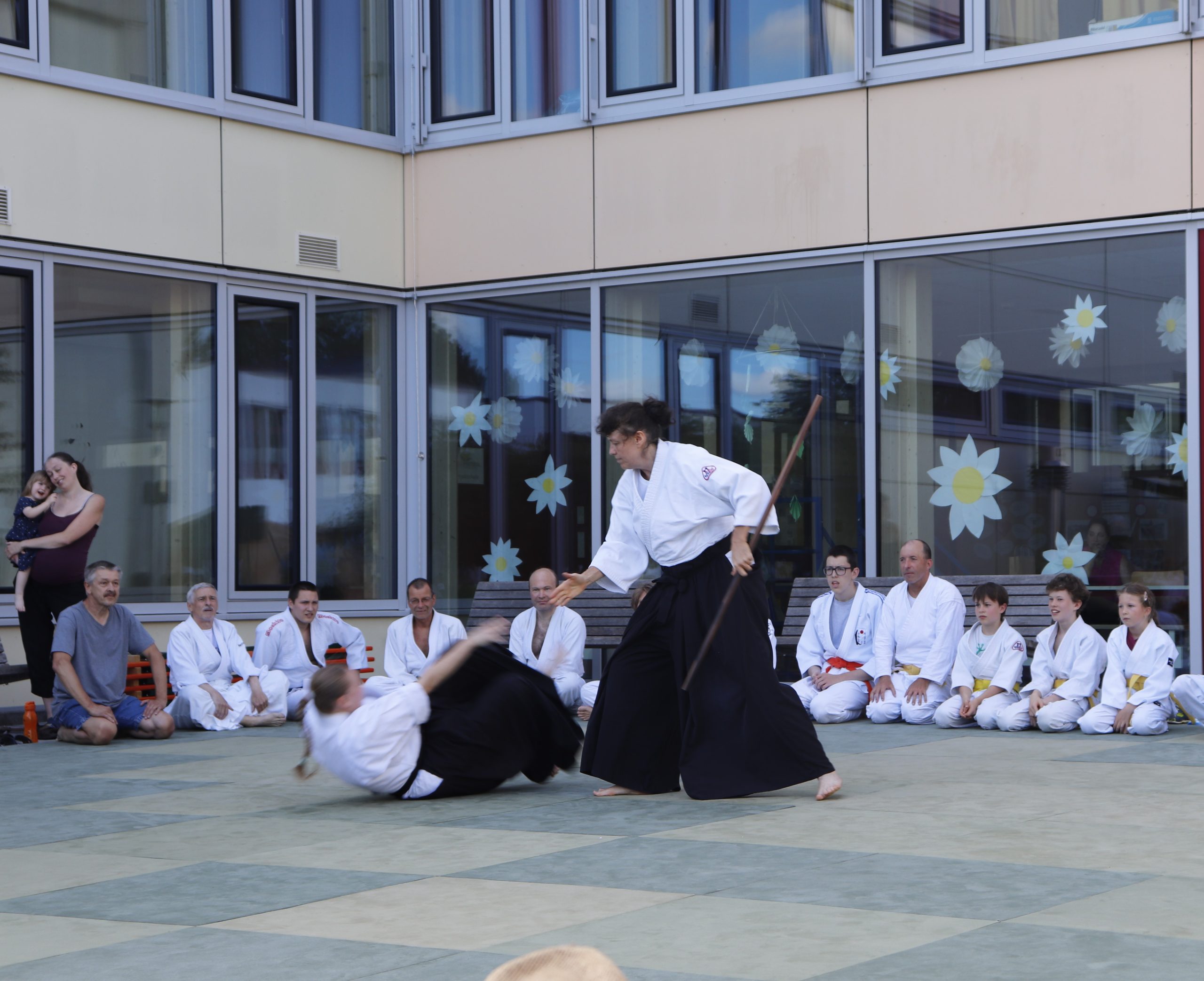 Nach wochenlangem Training war es um ca. 17 Uhr dann endlich so weit: Am Haupteingang der Mittelschule wurden noch schnell unsere Matten ausgelegt und dann ging es endlich los. Unsere jungen Aikidoka begannen mit der Fallschule. Im Anschluss führten die Minis voller Eifer ihre ersten gelernten Techniken vor. Nun stieg die Konzentration der Kinder, Jugendlichen und der Erwachsenen. Es wurden die verschiedenen Fall- und Bodenhaltetechniken präsentiert, je nach Stand des Könnens. Zum Abschluss zeigten unsere Dan-Träger (Aikidoka mit schwarzem Gürtel), wie man Aikido im Alltag einsetzen kann und begeisterten die Zuschauer mit Techniken zur Abwehr von Angriffen mit Waffen. Alle Beteiligten freuten sich über die gelungene Aufführung und erhielten von den Zuschauern viel Beifall.