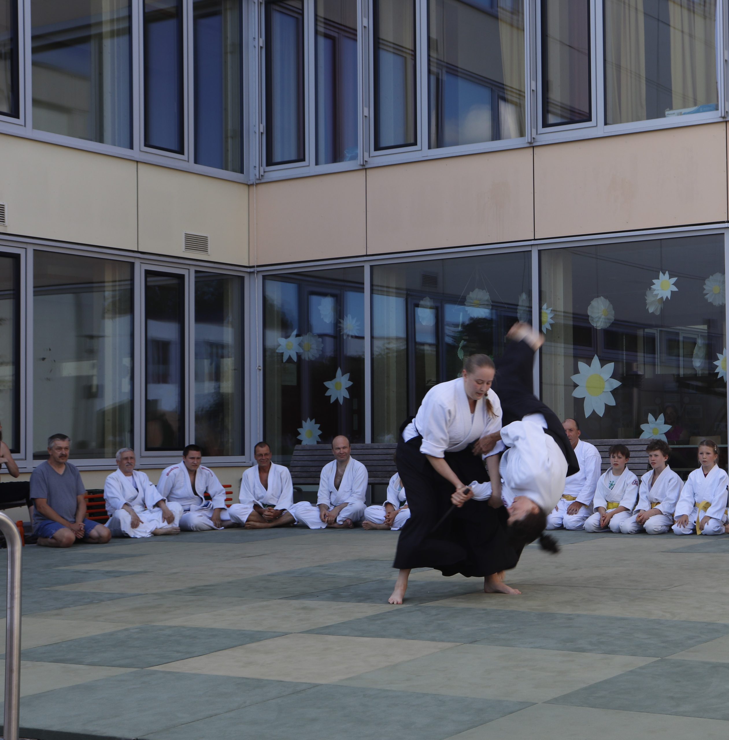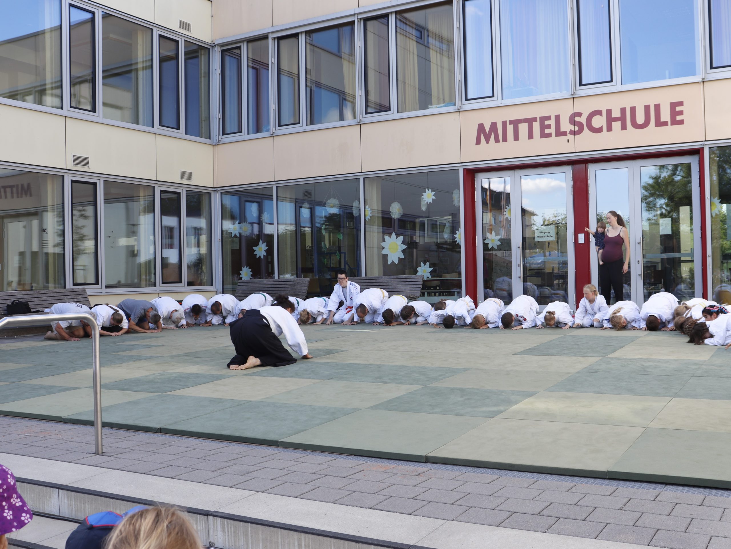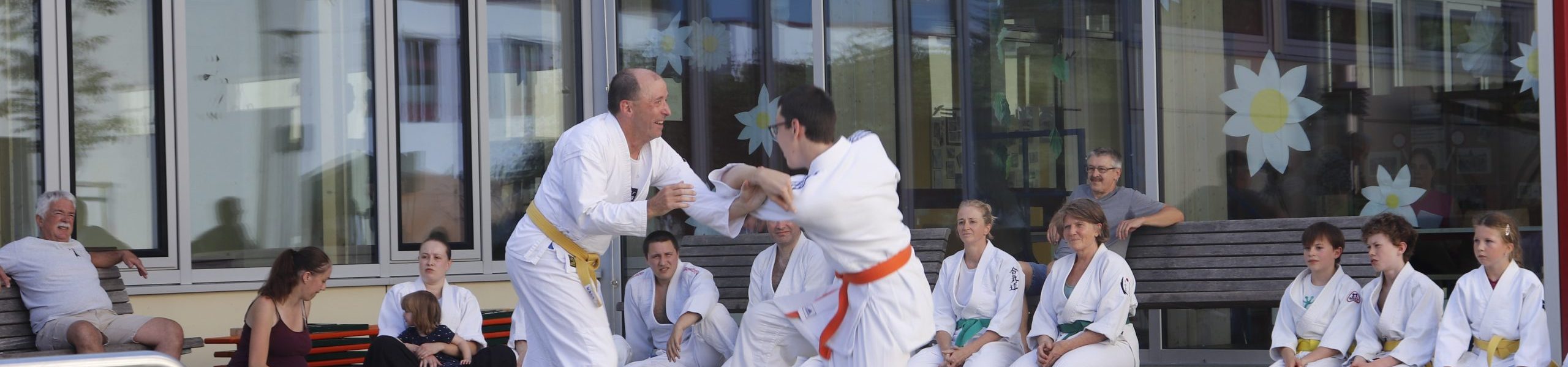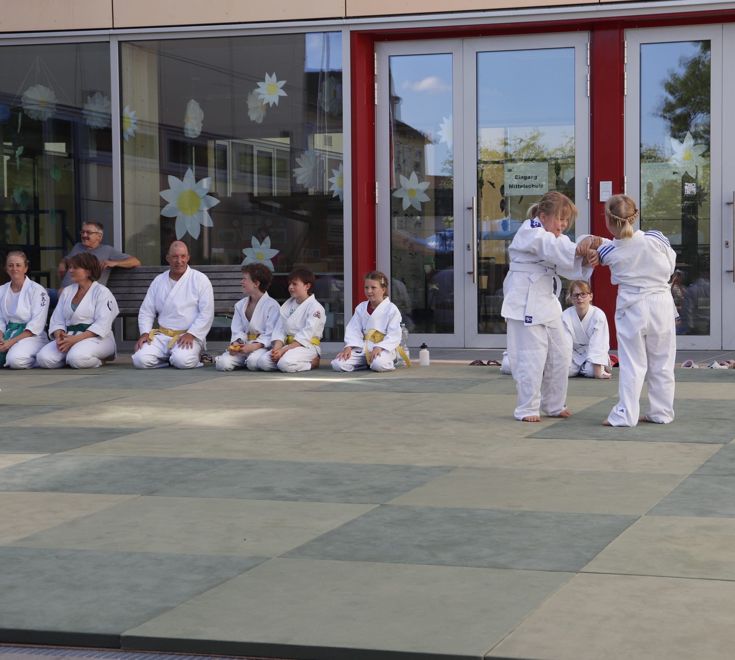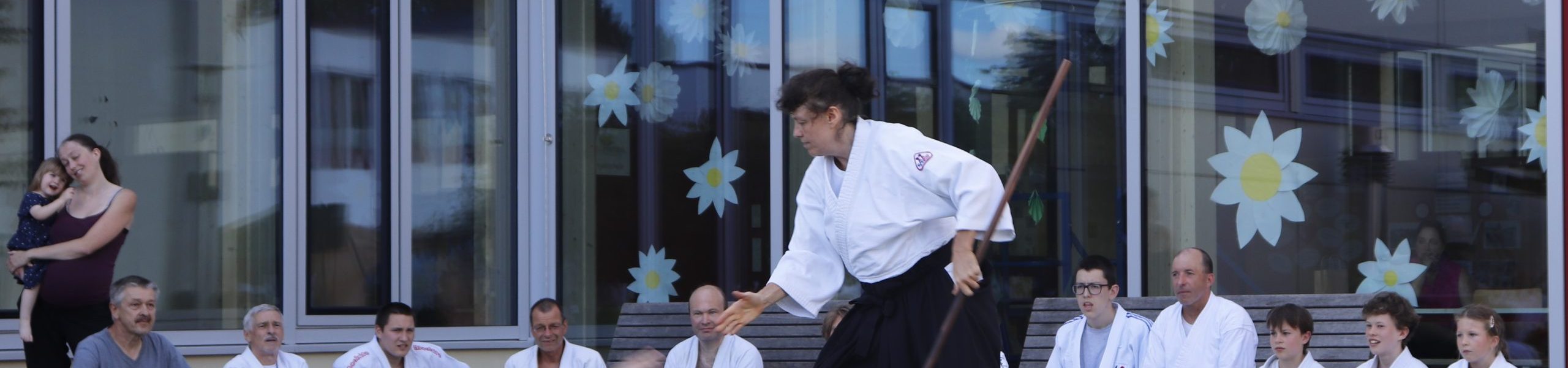 Nach wochenlangem Training war es um ca. 17 Uhr dann endlich so weit: Am Haupteingang der Mittelschule wurden noch schnell unsere Matten ausgelegt und dann ging es endlich los. Unsere jungen Aikidoka begannen mit der Fallschule. Im Anschluss führten die Minis voller Eifer ihre ersten gelernten Techniken vor. Nun stieg die Konzentration der Kinder, Jugendlichen und der Erwachsenen. Es wurden die verschiedenen Fall- und Bodenhaltetechniken präsentiert, je nach Stand des Könnens. Zum Abschluss zeigten unsere Dan-Träger (Aikidoka mit schwarzem Gürtel), wie man Aikido im Alltag einsetzen kann und begeisterten die Zuschauer mit Techniken zur Abwehr von Angriffen mit Waffen. Alle Beteiligten freuten sich über die gelungene Aufführung und erhielten von den Zuschauern viel Beifall.