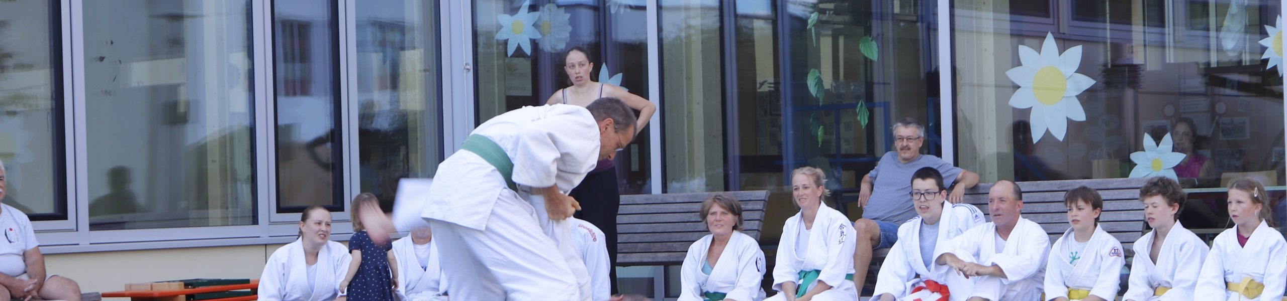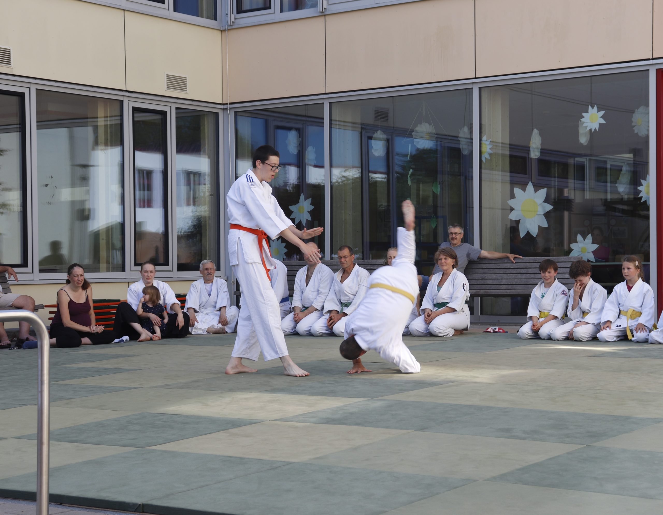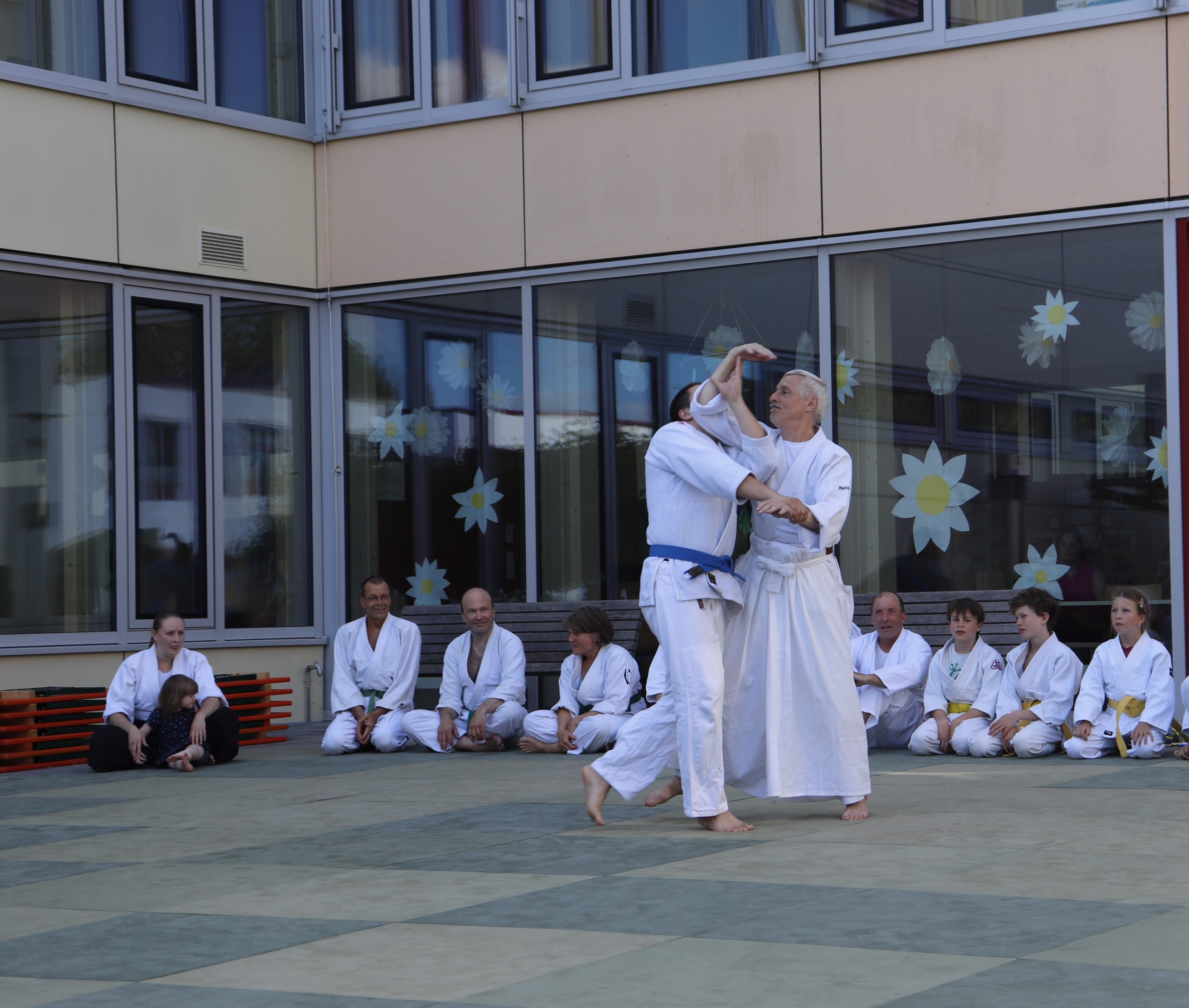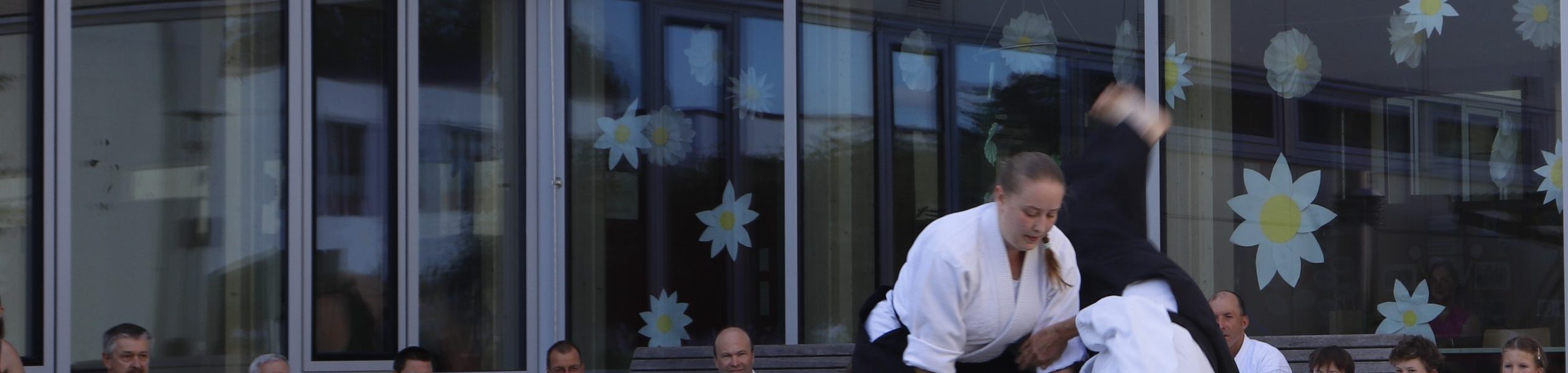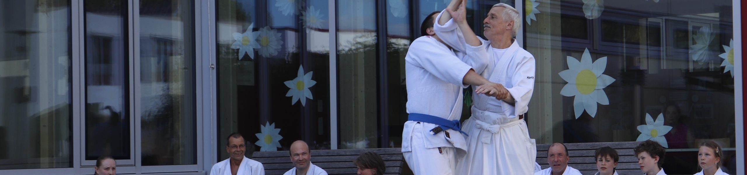 Nach wochenlangem Training war es um ca. 17 Uhr dann endlich so weit: Am Haupteingang der Mittelschule wurden noch schnell unsere Matten ausgelegt und dann ging es endlich los. Unsere jungen Aikidoka begannen mit der Fallschule. Im Anschluss führten die Minis voller Eifer ihre ersten gelernten Techniken vor. Nun stieg die Konzentration der Kinder, Jugendlichen und der Erwachsenen. Es wurden die verschiedenen Fall- und Bodenhaltetechniken präsentiert, je nach Stand des Könnens. Zum Abschluss zeigten unsere Dan-Träger (Aikidoka mit schwarzem Gürtel), wie man Aikido im Alltag einsetzen kann und begeisterten die Zuschauer mit Techniken zur Abwehr von Angriffen mit Waffen. Alle Beteiligten freuten sich über die gelungene Aufführung und erhielten von den Zuschauern viel Beifall.