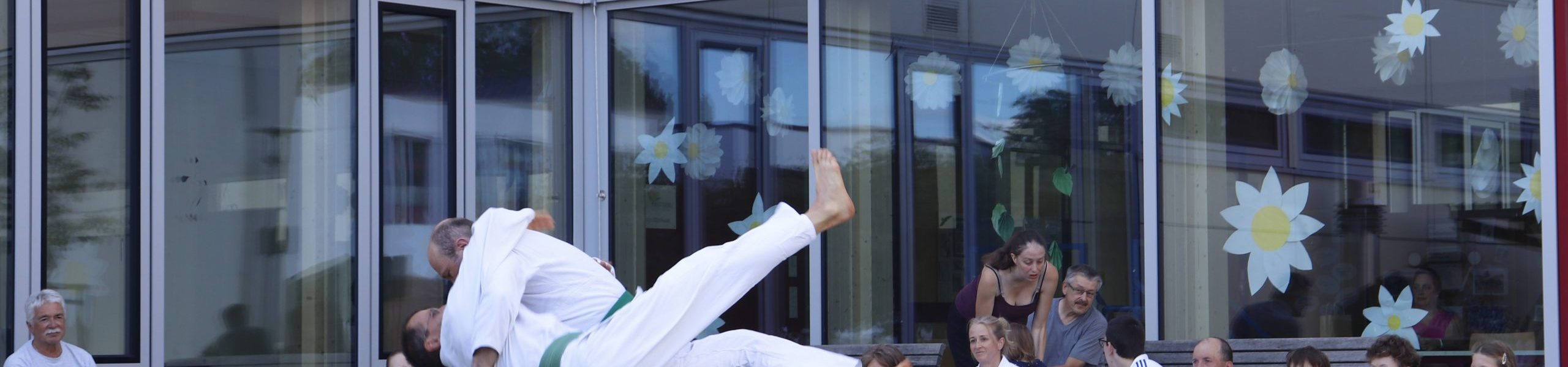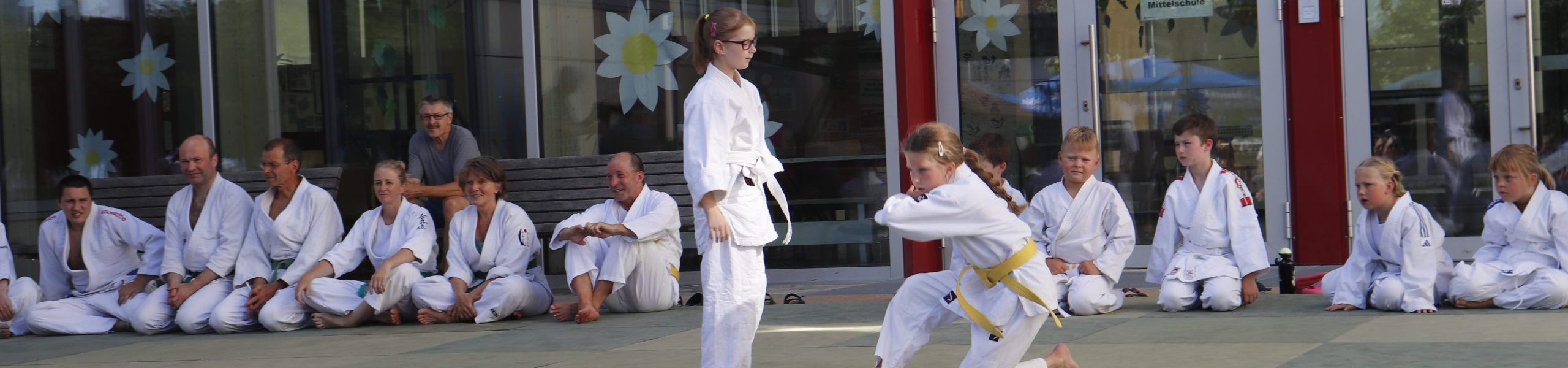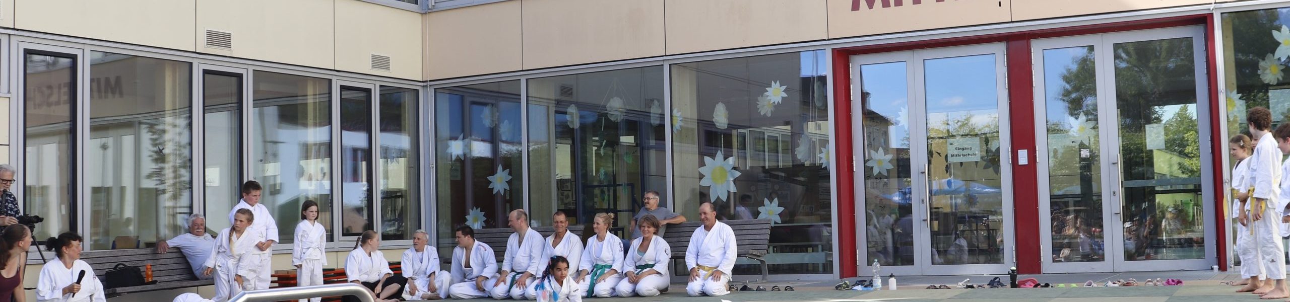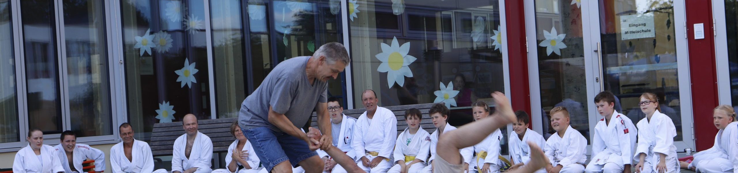Nach wochenlangem Training war es um ca. 17 Uhr dann endlich so weit: Am Haupteingang der Mittelschule wurden noch schnell unsere Matten ausgelegt und dann ging es endlich los. Unsere jungen Aikidoka begannen mit der Fallschule. Im Anschluss führten die Minis voller Eifer ihre ersten gelernten Techniken vor. Nun stieg die Konzentration der Kinder, Jugendlichen und der Erwachsenen. Es wurden die verschiedenen Fall- und Bodenhaltetechniken präsentiert, je nach Stand des Könnens. Zum Abschluss zeigten unsere Dan-Träger (Aikidoka mit schwarzem Gürtel), wie man Aikido im Alltag einsetzen kann und begeisterten die Zuschauer mit Techniken zur Abwehr von Angriffen mit Waffen. Alle Beteiligten freuten sich über die gelungene Aufführung und erhielten von den Zuschauern viel Beifall.
