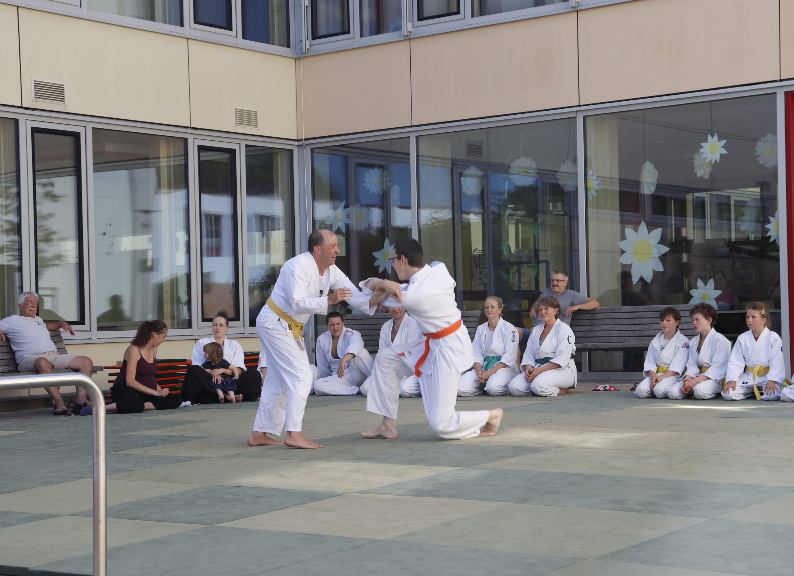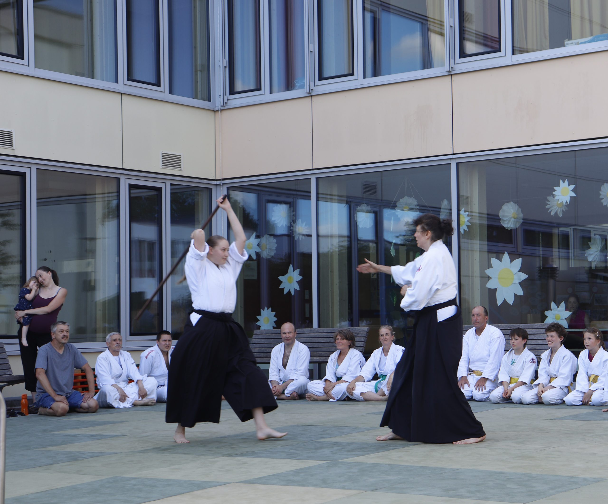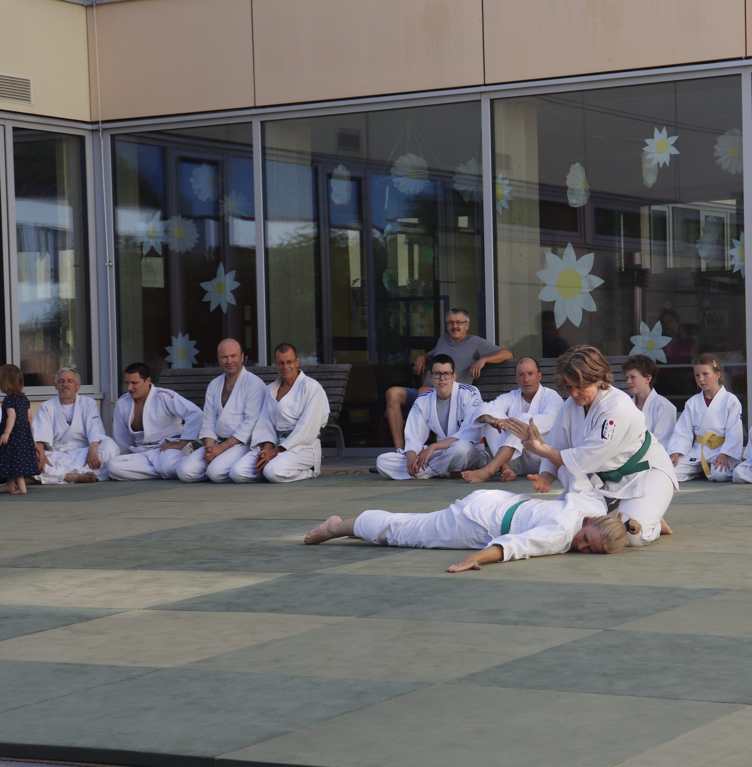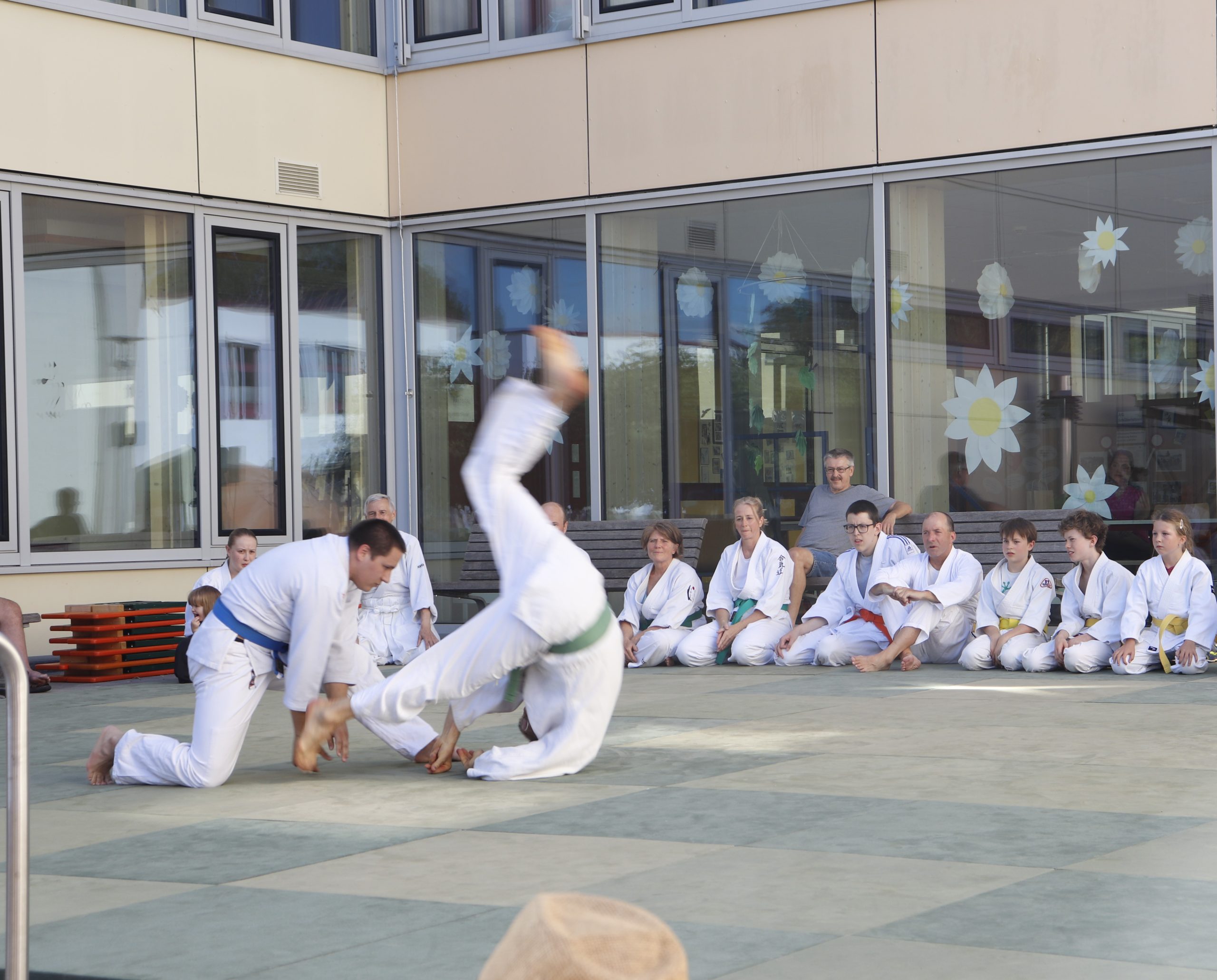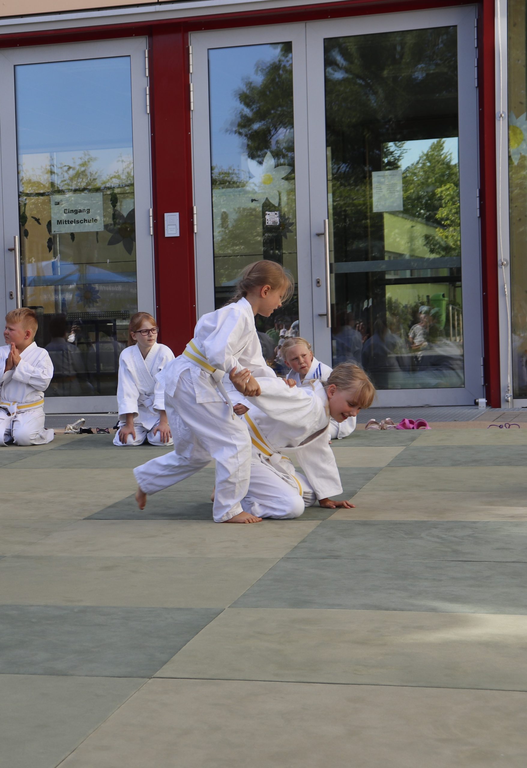 Nach wochenlangem Training war es um ca. 17 Uhr dann endlich so weit: Am Haupteingang der Mittelschule wurden noch schnell unsere Matten ausgelegt und dann ging es endlich los. Unsere jungen Aikidoka begannen mit der Fallschule. Im Anschluss führten die Minis voller Eifer ihre ersten gelernten Techniken vor. Nun stieg die Konzentration der Kinder, Jugendlichen und der Erwachsenen. Es wurden die verschiedenen Fall- und Bodenhaltetechniken präsentiert, je nach Stand des Könnens. Zum Abschluss zeigten unsere Dan-Träger (Aikidoka mit schwarzem Gürtel), wie man Aikido im Alltag einsetzen kann und begeisterten die Zuschauer mit Techniken zur Abwehr von Angriffen mit Waffen. Alle Beteiligten freuten sich über die gelungene Aufführung und erhielten von den Zuschauern viel Beifall.