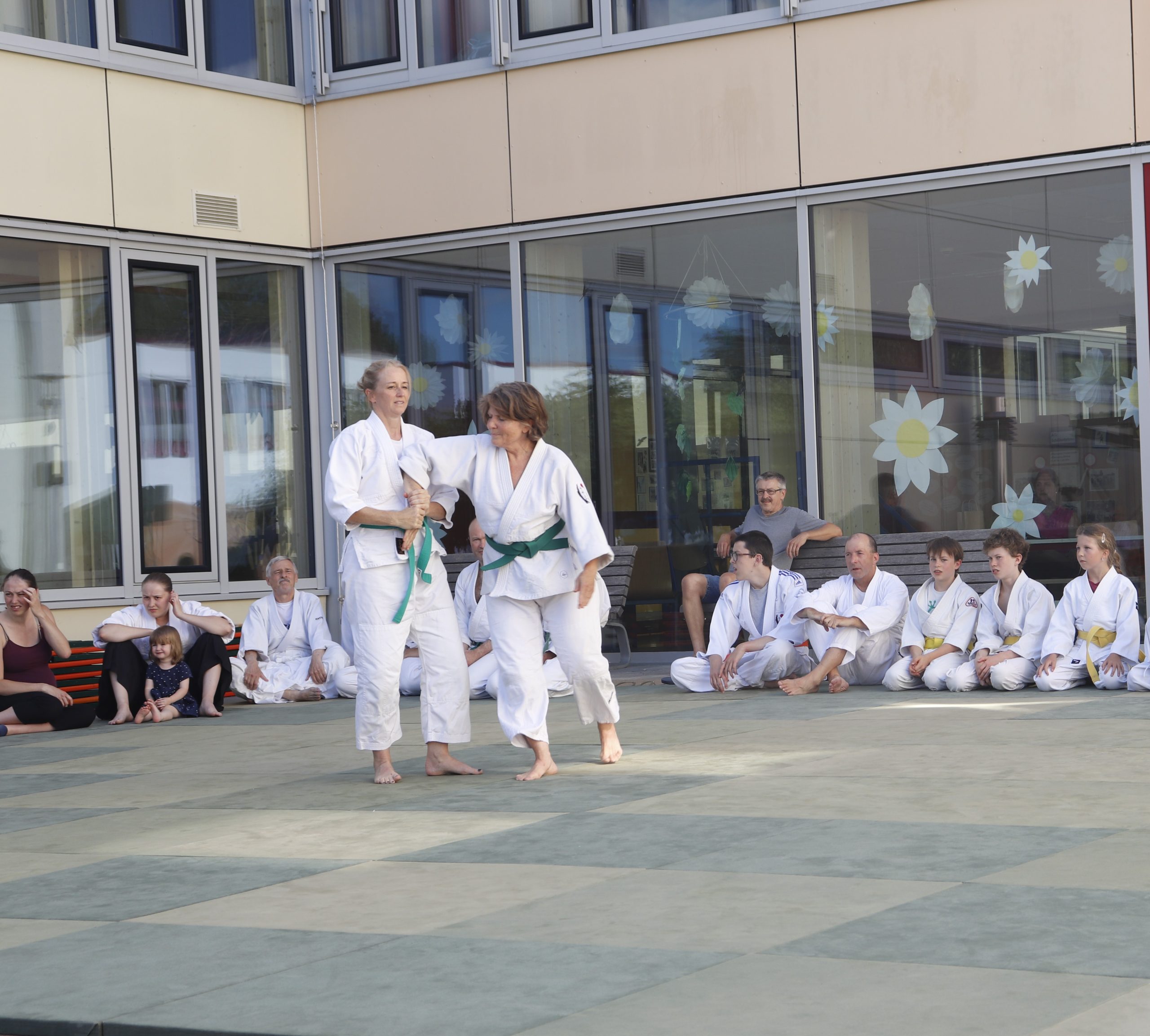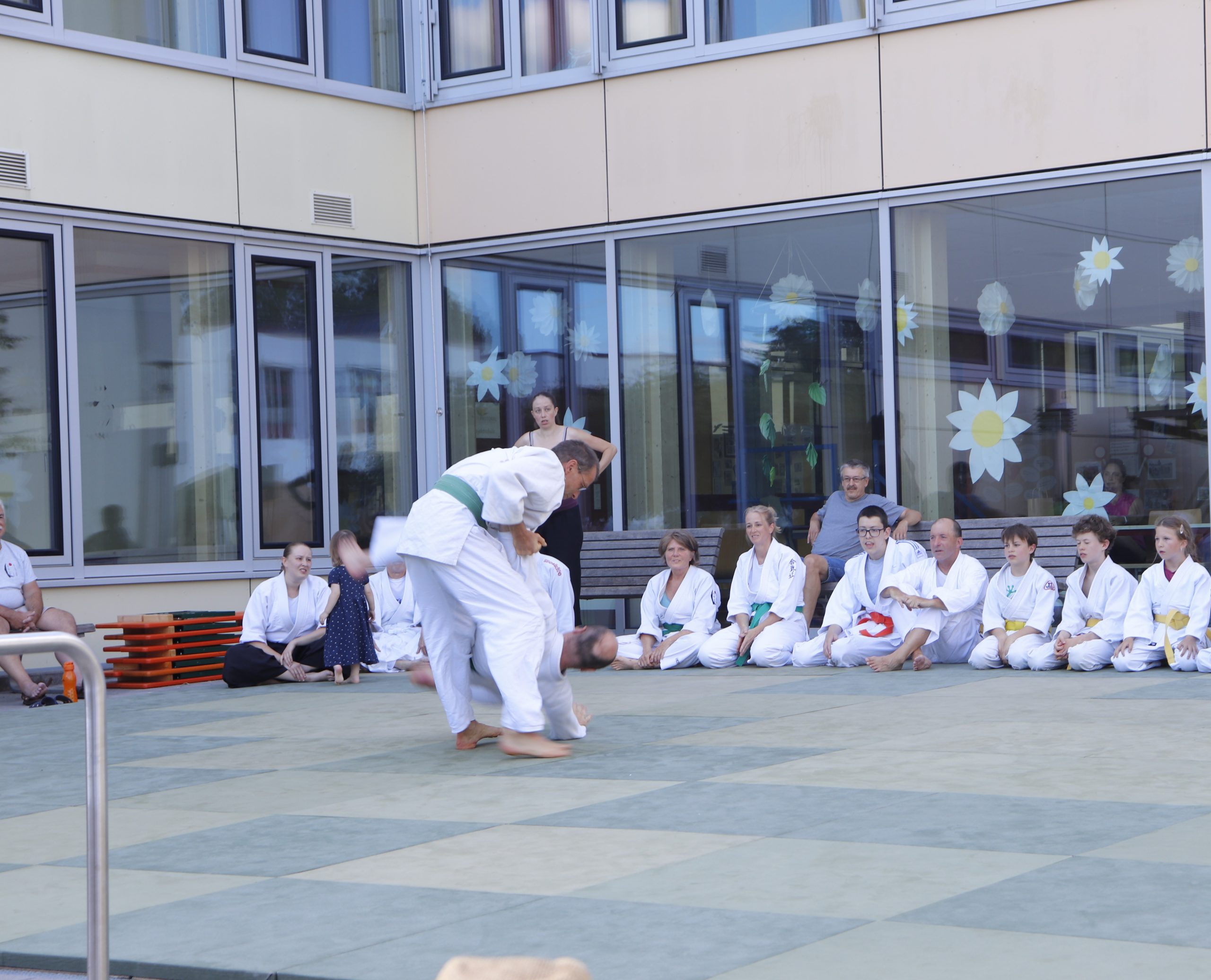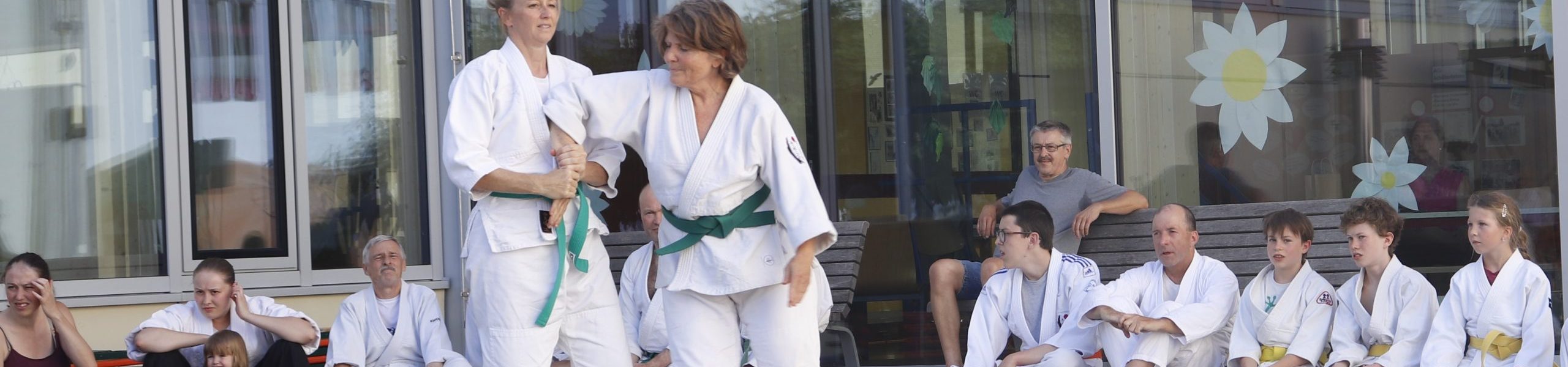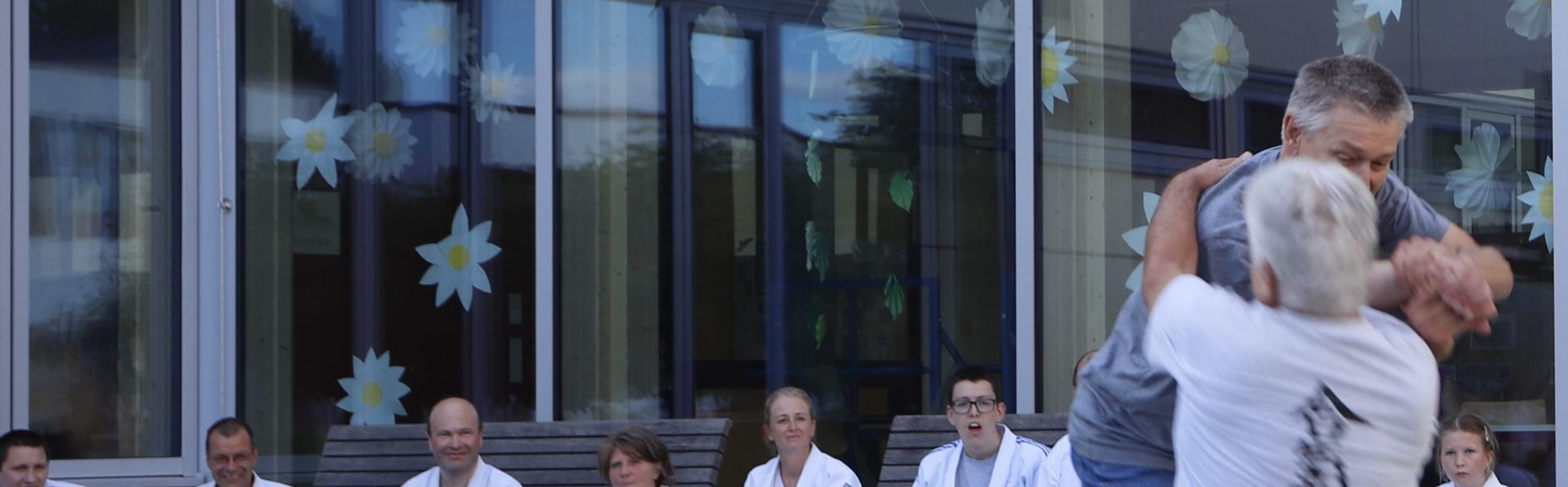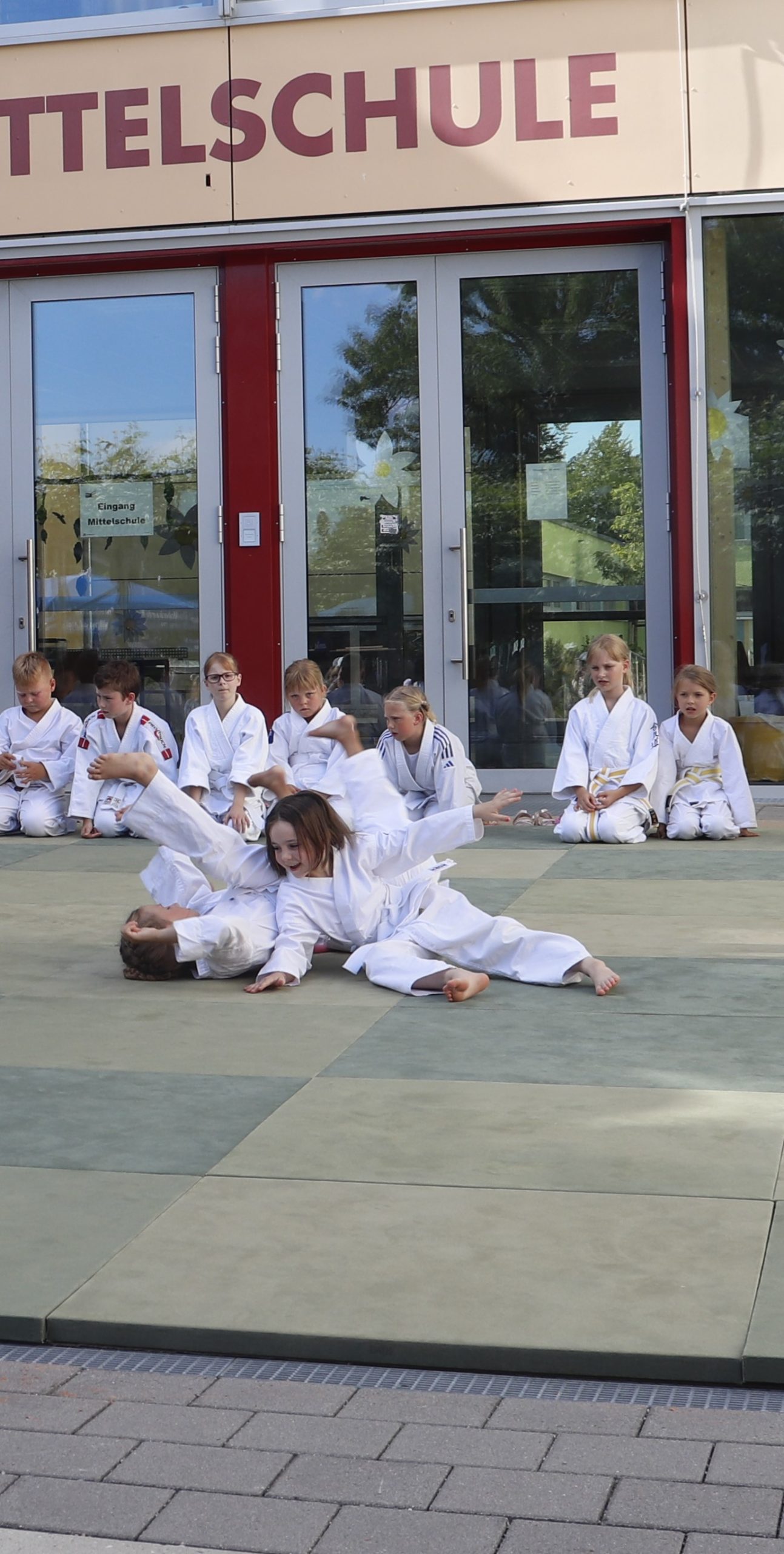 Nach wochenlangem Training war es um ca. 17 Uhr dann endlich so weit: Am Haupteingang der Mittelschule wurden noch schnell unsere Matten ausgelegt und dann ging es endlich los. Unsere jungen Aikidoka begannen mit der Fallschule. Im Anschluss führten die Minis voller Eifer ihre ersten gelernten Techniken vor. Nun stieg die Konzentration der Kinder, Jugendlichen und der Erwachsenen. Es wurden die verschiedenen Fall- und Bodenhaltetechniken präsentiert, je nach Stand des Könnens. Zum Abschluss zeigten unsere Dan-Träger (Aikidoka mit schwarzem Gürtel), wie man Aikido im Alltag einsetzen kann und begeisterten die Zuschauer mit Techniken zur Abwehr von Angriffen mit Waffen. Alle Beteiligten freuten sich über die gelungene Aufführung und erhielten von den Zuschauern viel Beifall.