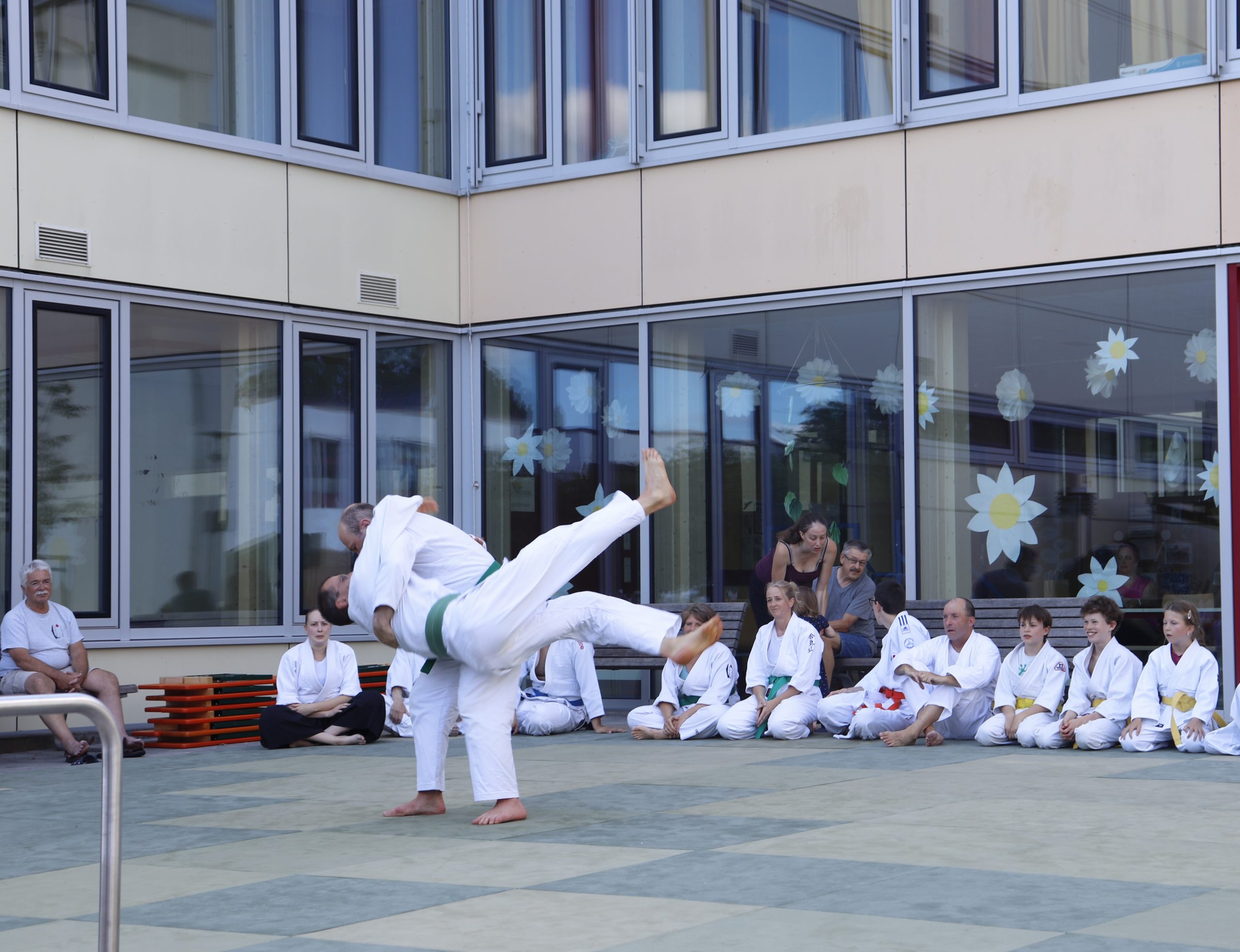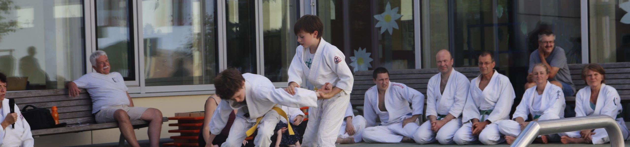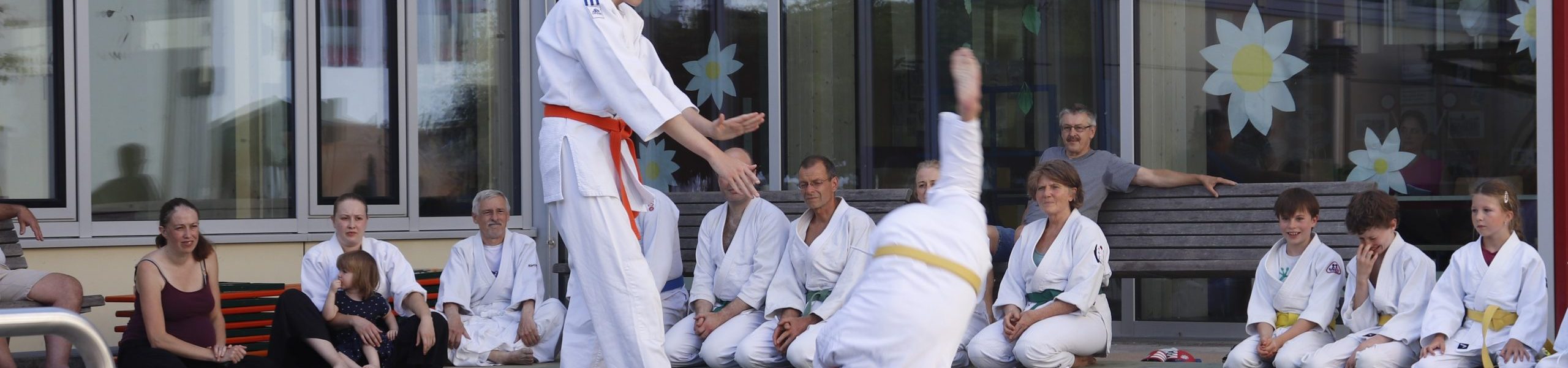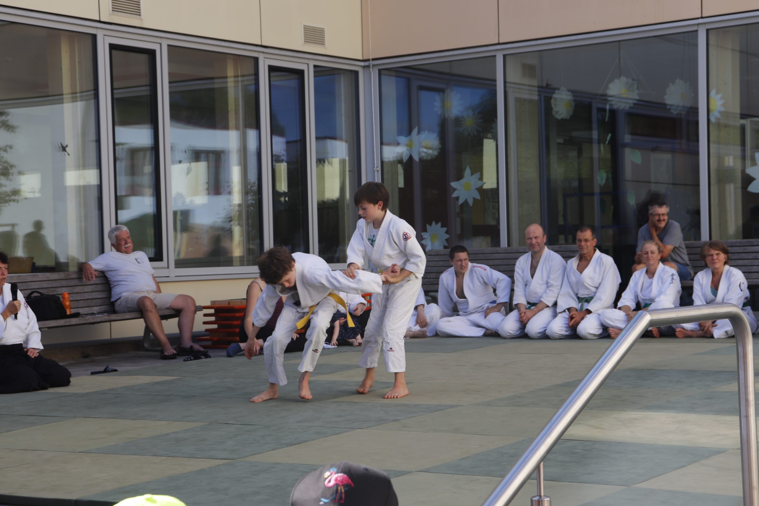 Nach wochenlangem Training war es um ca. 17 Uhr dann endlich so weit: Am Haupteingang der Mittelschule wurden noch schnell unsere Matten ausgelegt und dann ging es endlich los. Unsere jungen Aikidoka begannen mit der Fallschule. Im Anschluss führten die Minis voller Eifer ihre ersten gelernten Techniken vor. Nun stieg die Konzentration der Kinder, Jugendlichen und der Erwachsenen. Es wurden die verschiedenen Fall- und Bodenhaltetechniken präsentiert, je nach Stand des Könnens. Zum Abschluss zeigten unsere Dan-Träger (Aikidoka mit schwarzem Gürtel), wie man Aikido im Alltag einsetzen kann und begeisterten die Zuschauer mit Techniken zur Abwehr von Angriffen mit Waffen. Alle Beteiligten freuten sich über die gelungene Aufführung und erhielten von den Zuschauern viel Beifall.