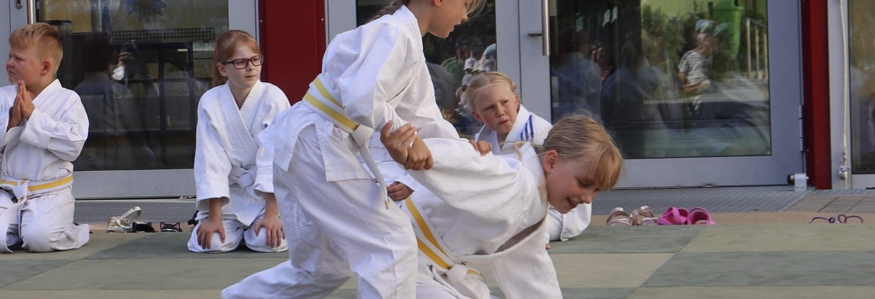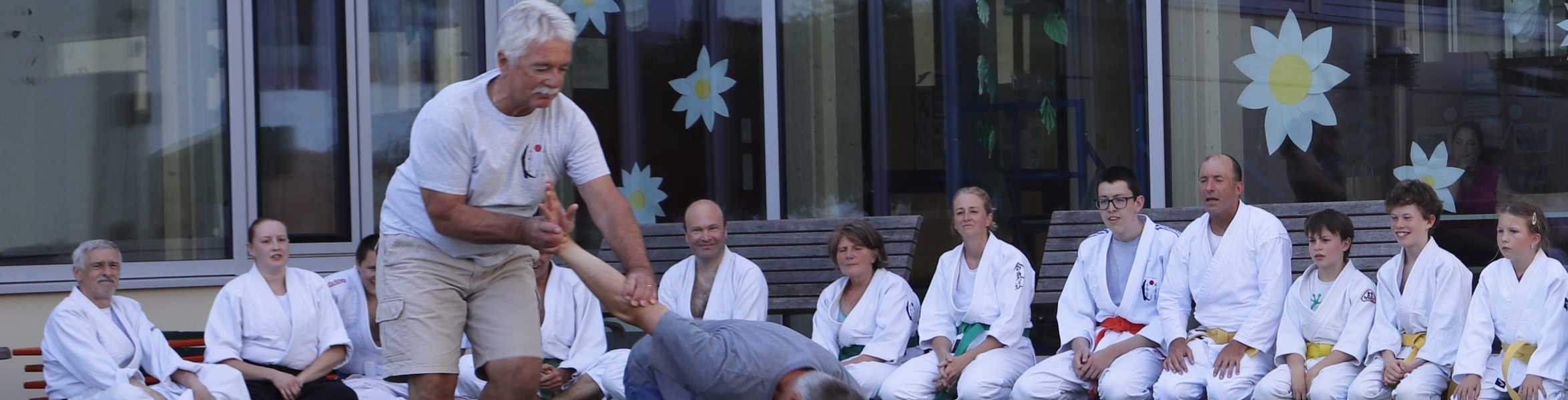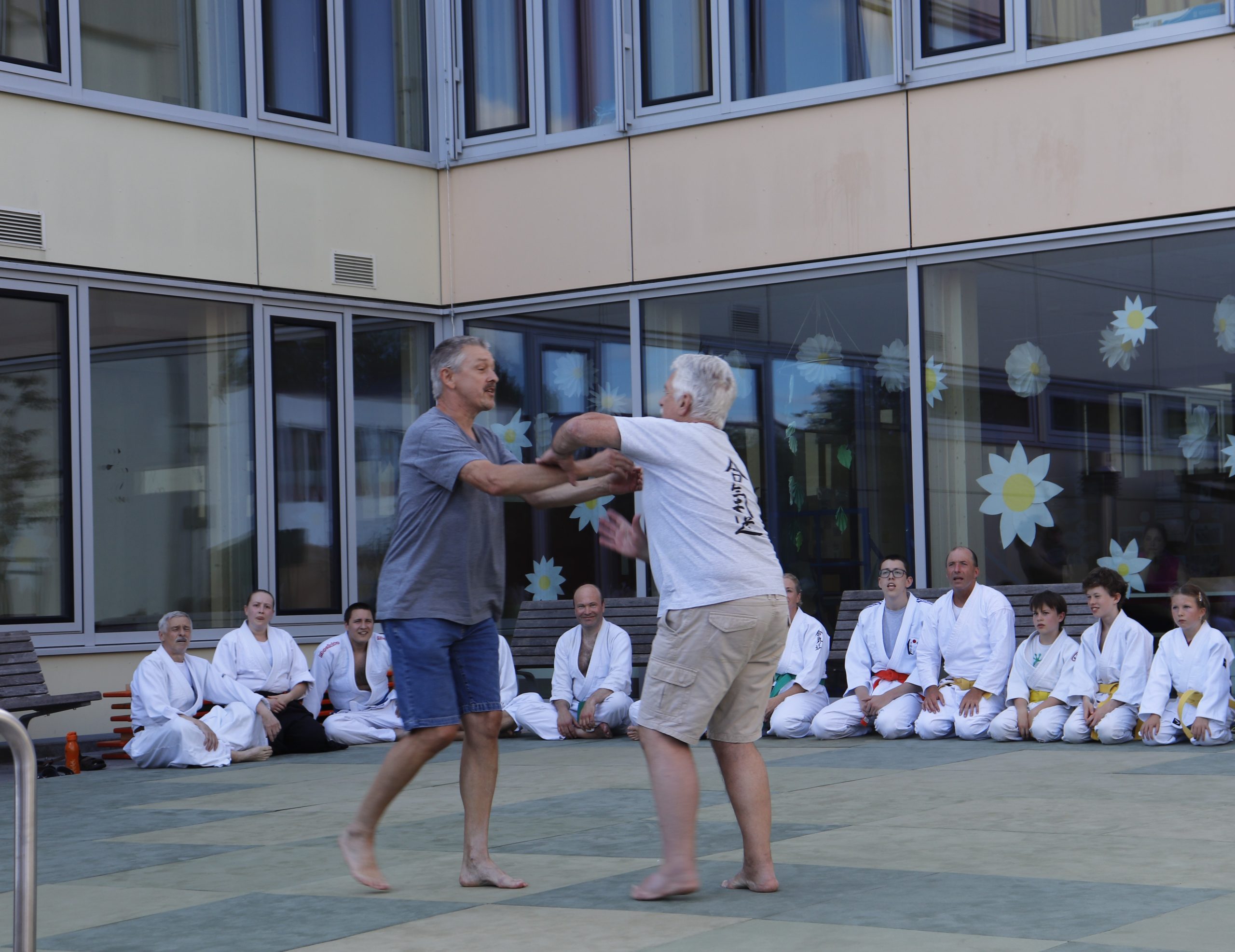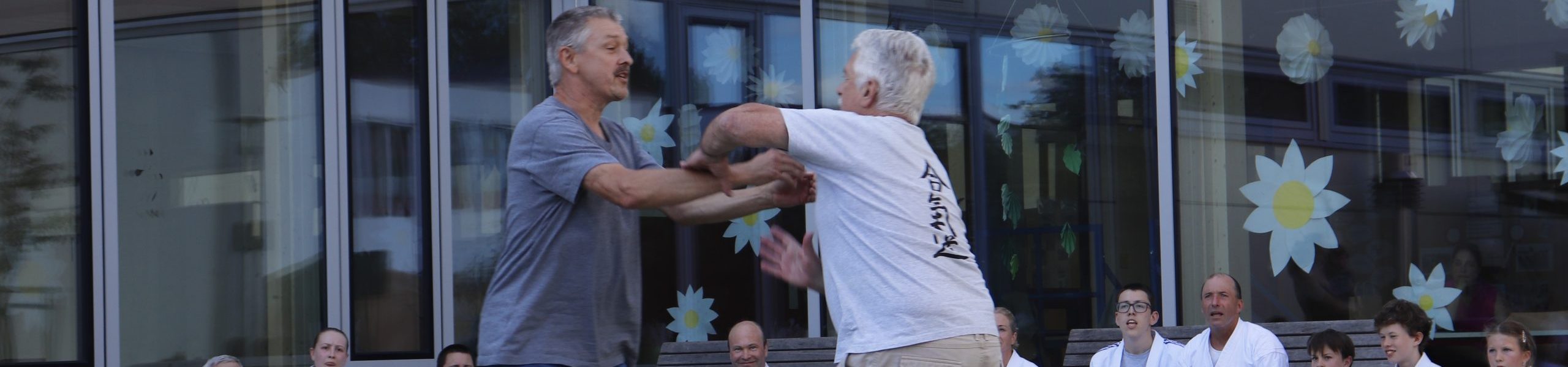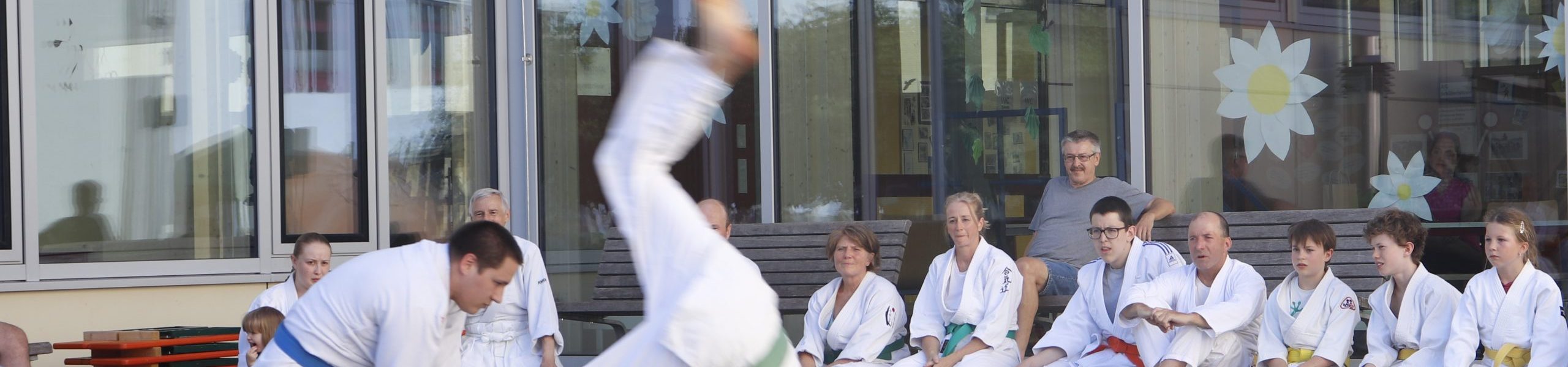 Nach wochenlangem Training war es um ca. 17 Uhr dann endlich so weit: Am Haupteingang der Mittelschule wurden noch schnell unsere Matten ausgelegt und dann ging es endlich los. Unsere jungen Aikidoka begannen mit der Fallschule. Im Anschluss führten die Minis voller Eifer ihre ersten gelernten Techniken vor. Nun stieg die Konzentration der Kinder, Jugendlichen und der Erwachsenen. Es wurden die verschiedenen Fall- und Bodenhaltetechniken präsentiert, je nach Stand des Könnens. Zum Abschluss zeigten unsere Dan-Träger (Aikidoka mit schwarzem Gürtel), wie man Aikido im Alltag einsetzen kann und begeisterten die Zuschauer mit Techniken zur Abwehr von Angriffen mit Waffen. Alle Beteiligten freuten sich über die gelungene Aufführung und erhielten von den Zuschauern viel Beifall.